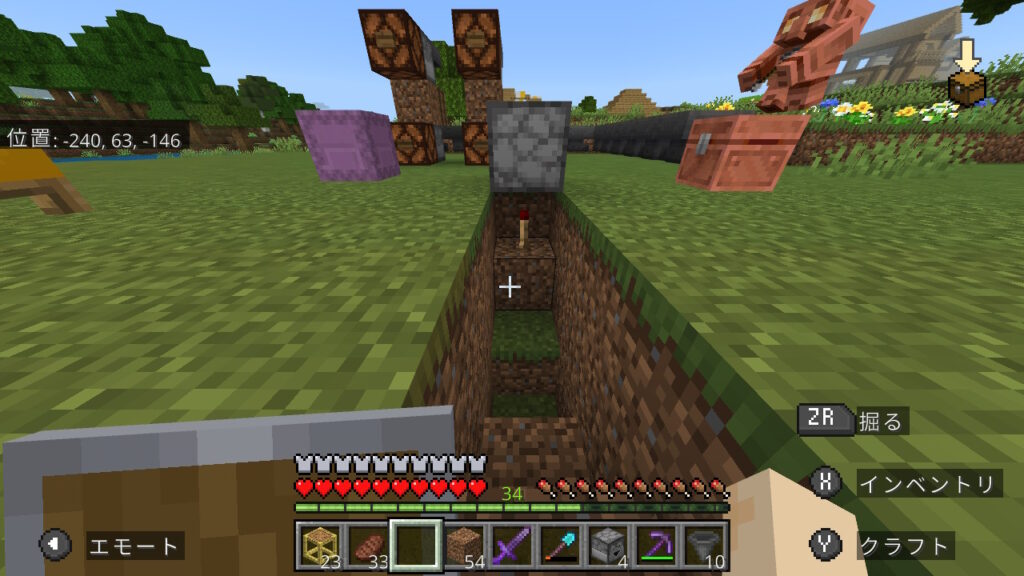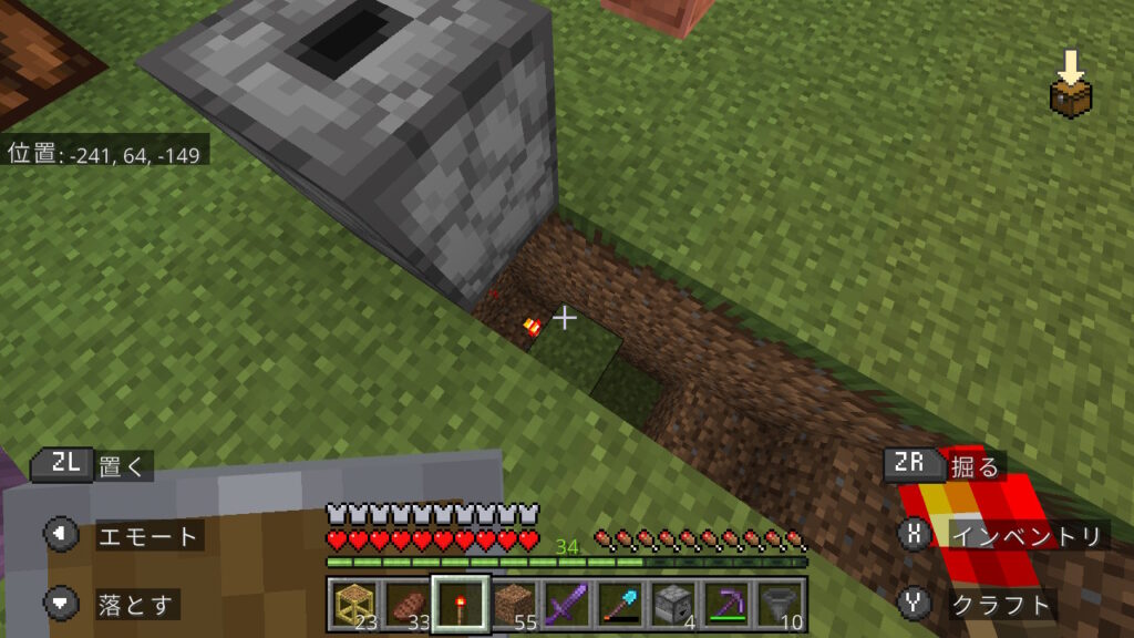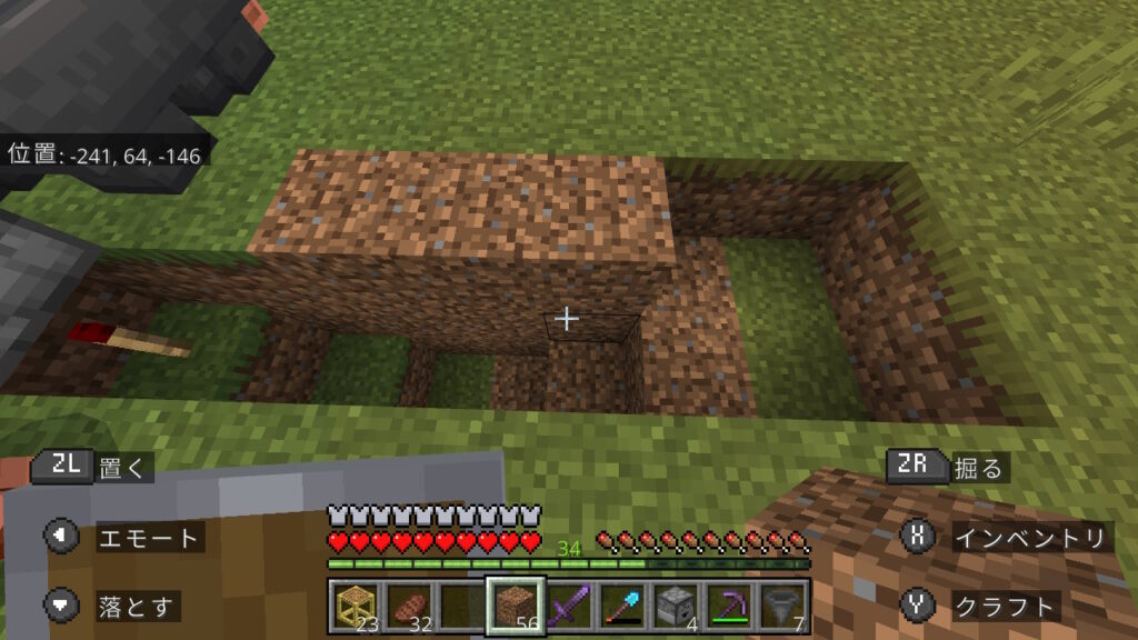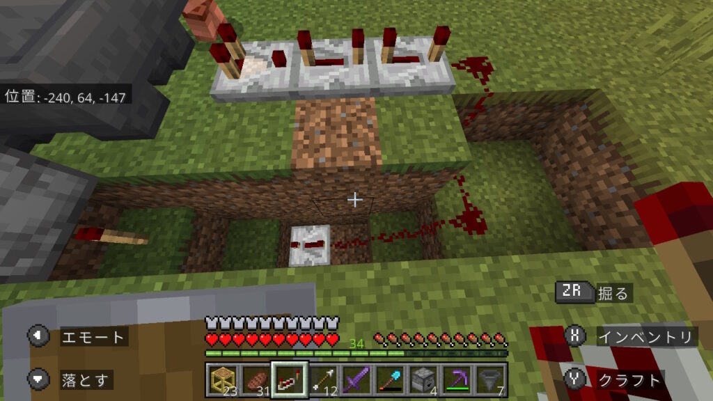 次はレッドストーン回路を組みます。レッドストーントーチを設置したブロックの横から、階段状にこんな感じで床を掘ります。