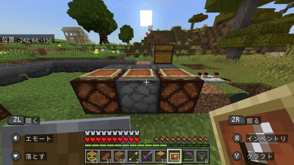 次は、銅ゴーレムが商品を入れるチェストと、商品を搬出する回路を作成していきます。