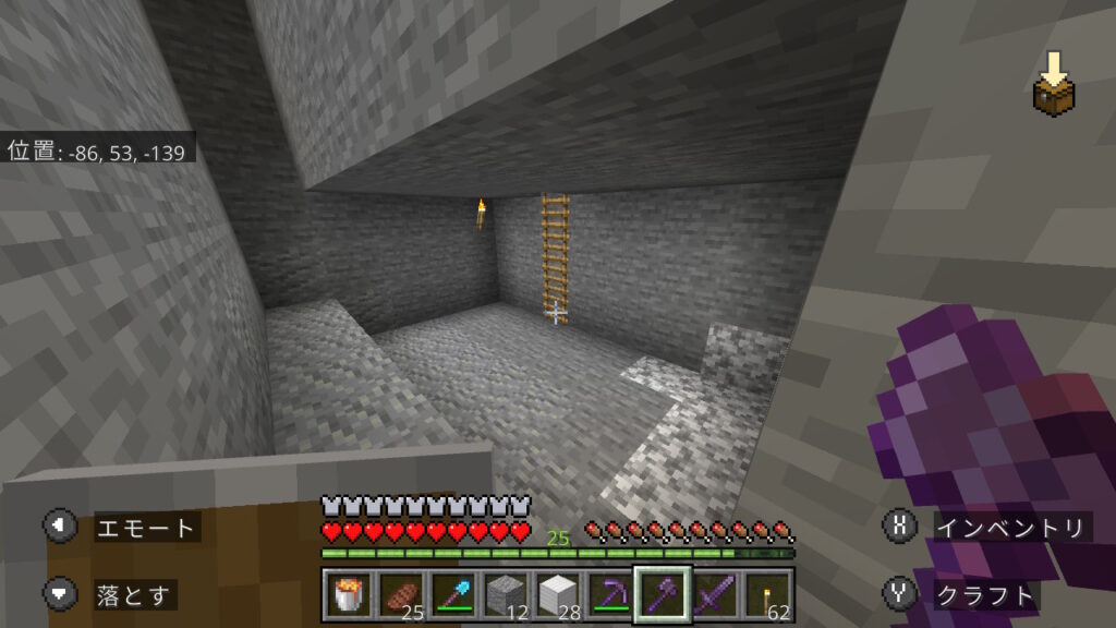 掘った方の壁沿いに、地上に出られるようにハシゴをつけます。