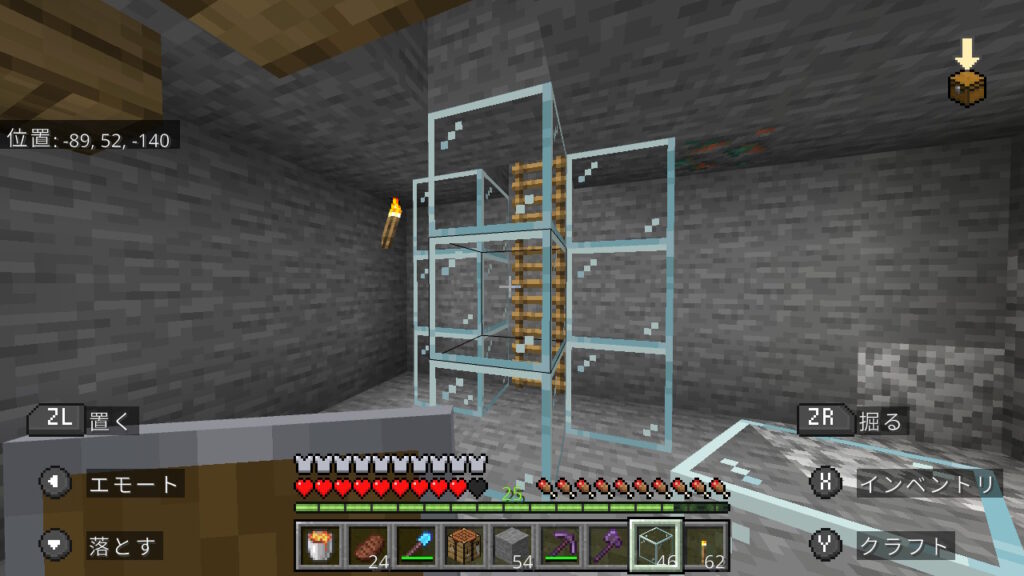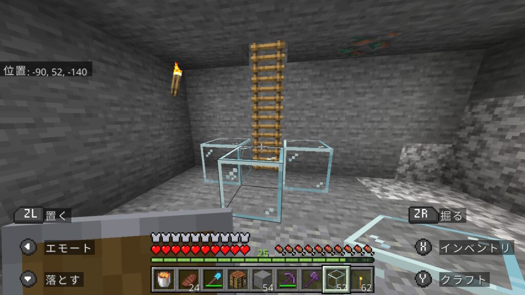 ハシゴのところで村人を観察したいのですが、このままだとプレイヤーが攻撃されてしまうのでハシゴをガラスで囲います。