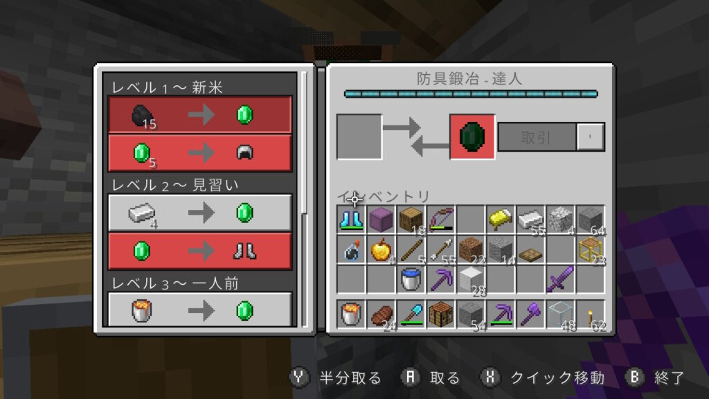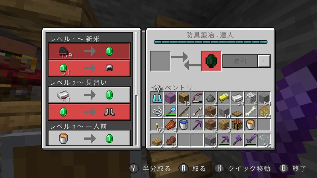 画像には写っていませんが、ダイヤモンドのレギンスが22エメラルドだったものが1エメラルドになっていました。鉄インゴット1つでダイヤのレギンスと交換できる計算ですね。恐ろしいです。