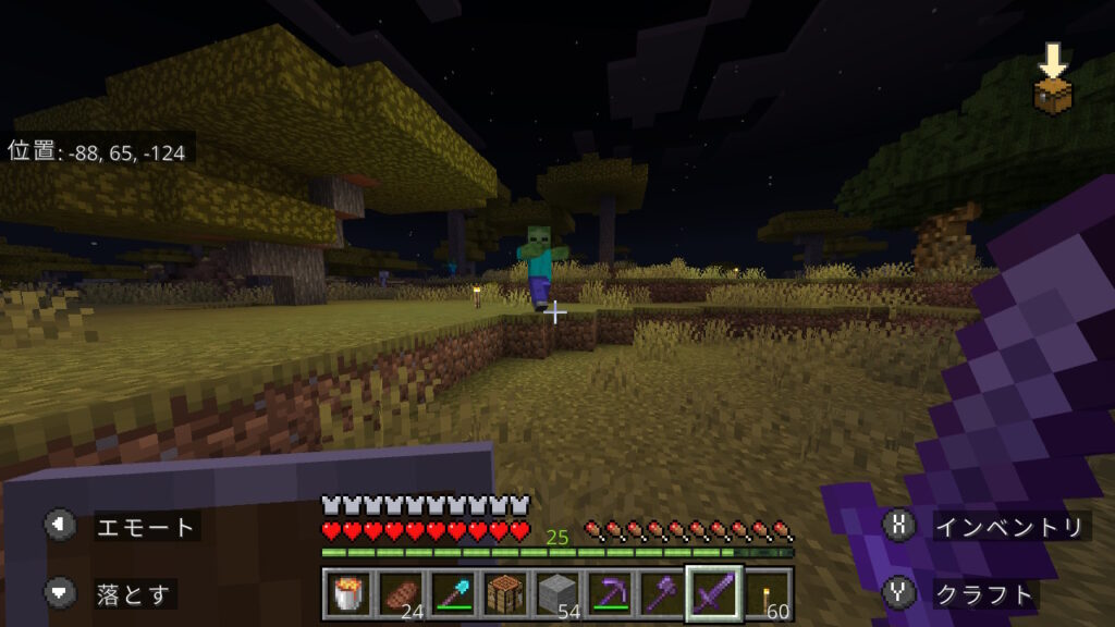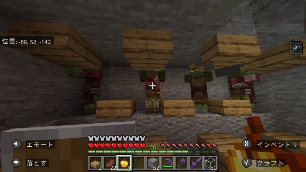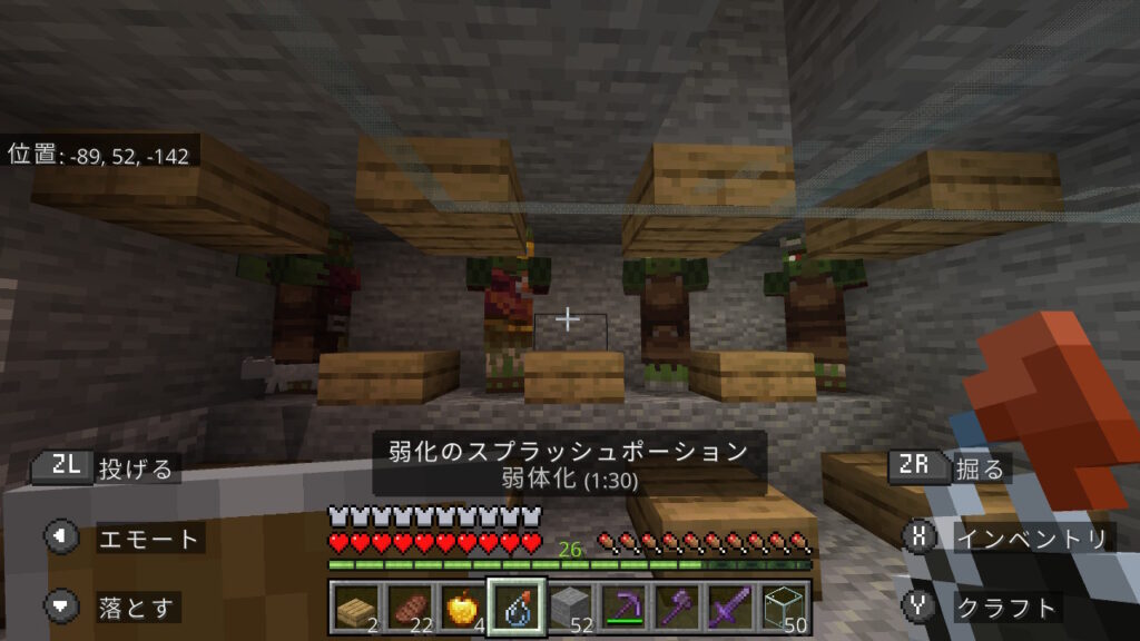 その後、ゾンビのど真ん中に向けて弱化のスプラッシュポーションを投げつけます。画像の位置に投げれば問題ないです。