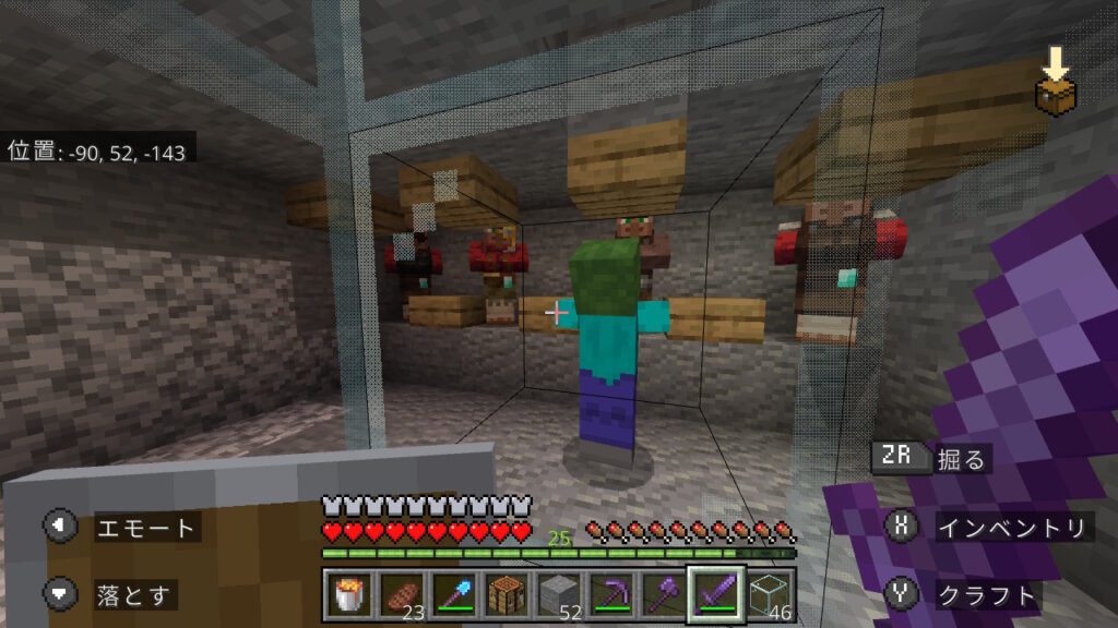 そのあとすぐに、村人ゾンビにカーソルを合わせた状態で金のリンゴをZLボタンで使用します。