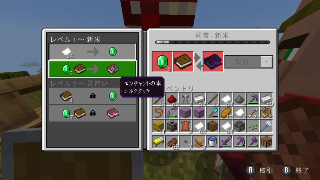 取引を一度した村人は、職業ブロックを破壊しても取引内容が変わることはありません。紙→エメラルドの取引でも大丈夫なので、欲しいエンチャントがあったら必ず忘れずに取引しましょう。