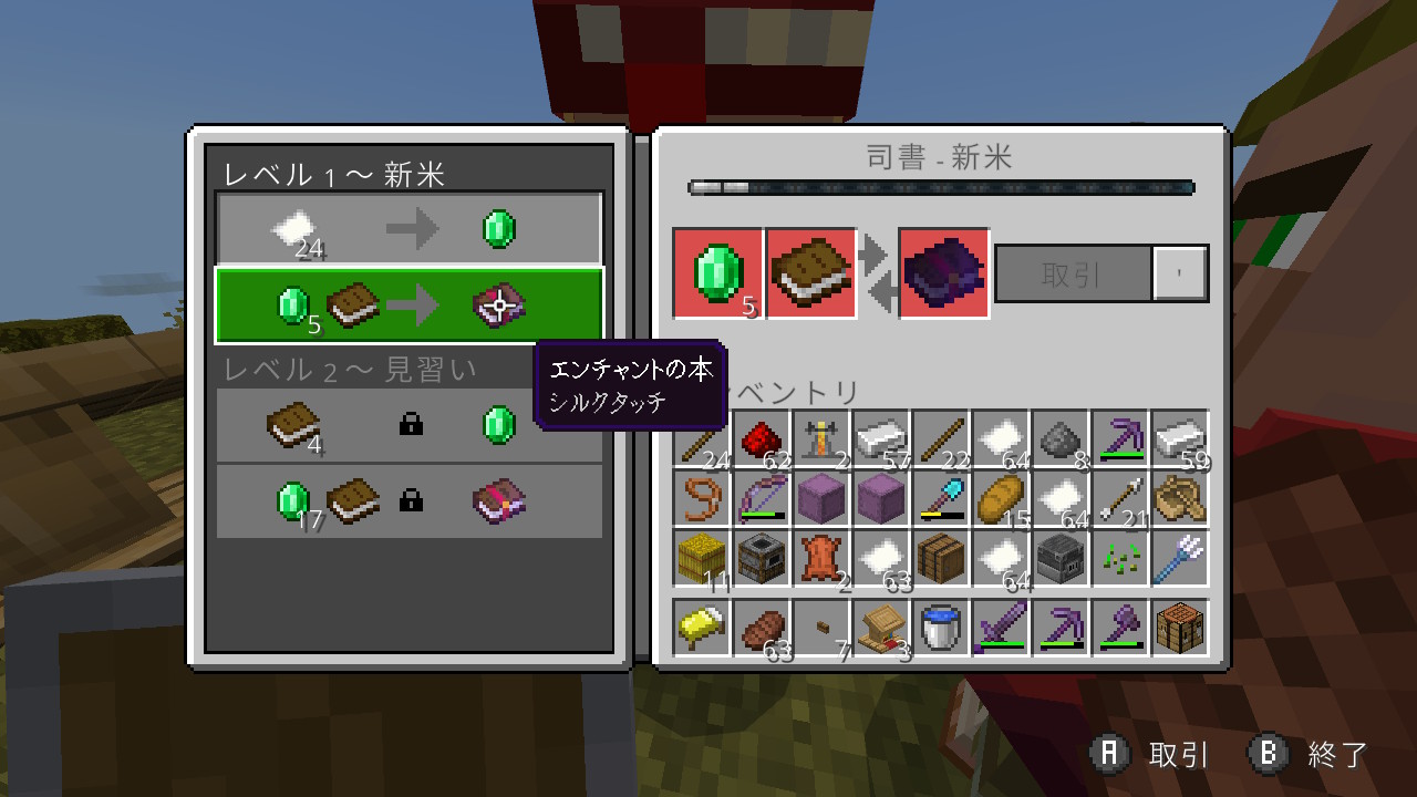 エンチャントの本の内容と価格はランダムのため、何度も就職と離職をして希望のエンチャントの本を取引してくれるまで繰り返すことを「司書ガチャ」と言います。