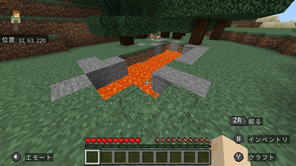 統合版はJava版に比べてマグマ溜まりが生成されづらいので、これはかなりラッキーです。