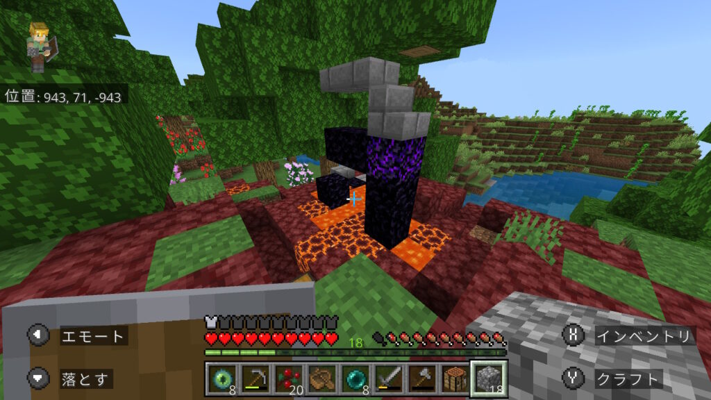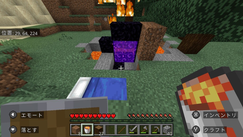 石のツール一式(剣、斧、ツルハシ)とバケツ、盾を作って先ほどのマグマ溜まりに戻ってネザーゲートを作成します。ネザーゲート作成のやり方はこちら。