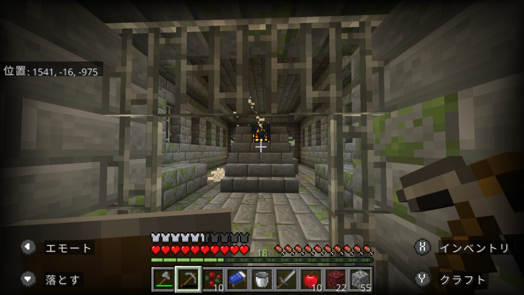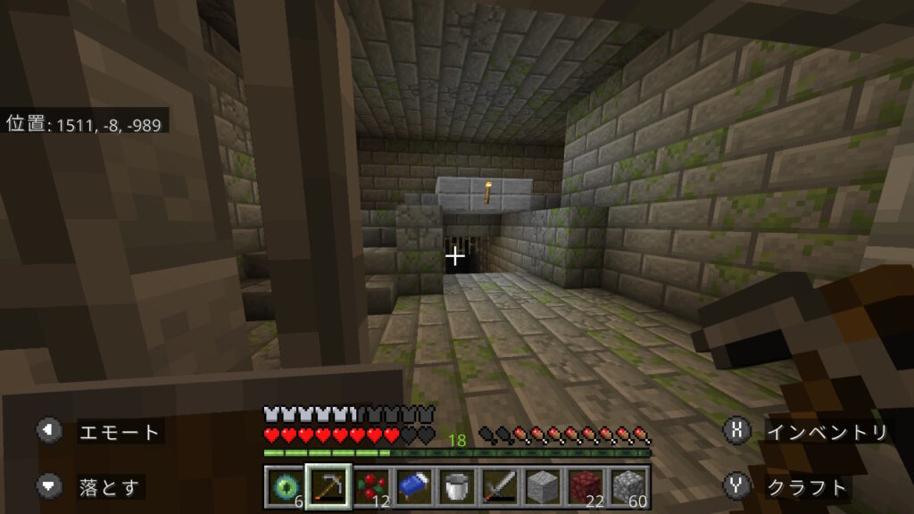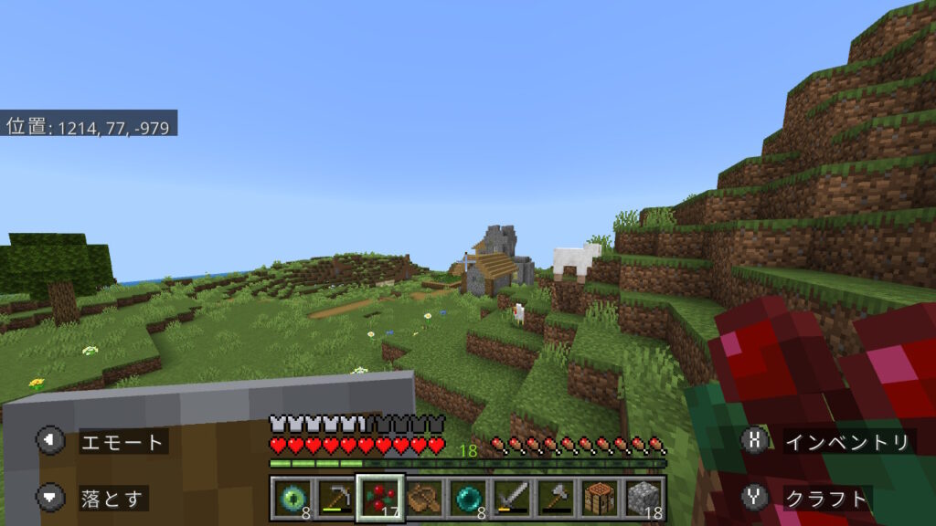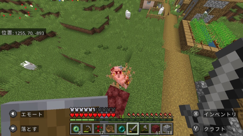 途中で村がありました。統合版は村の下にエンド要塞が生成される場合が多いので期待しましたが、ハズレでした。