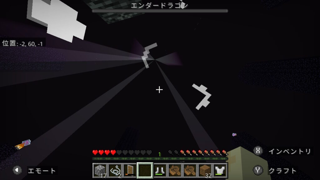 その後もエンダーマンにやられ、見えないブレスにやられ、体当たりにやられ…合計10回くらいやられながらも、なんとか倒しました。