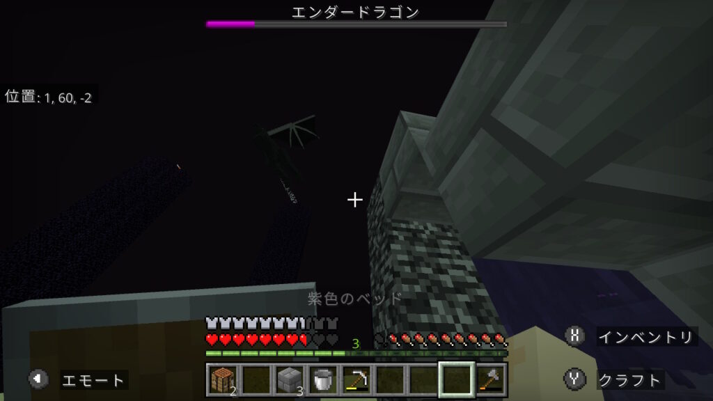 手持ちをベッド爆破仕様に持ち替えて、エンドラが降りてきたところをベッド爆破で狙います。