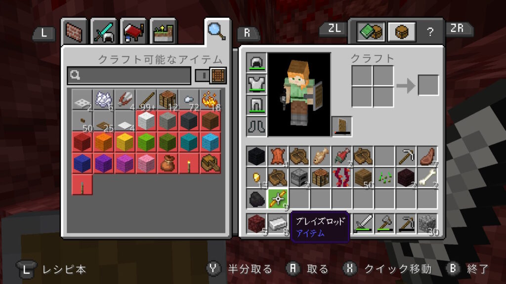最悪赤森は走って通り過ぎて青森まで行けばピグリンに襲われることも少ないだろうと考え、金装備を諦めてブレイズロッドを集め始めます。そして5分くらいですぐ集まりました。
