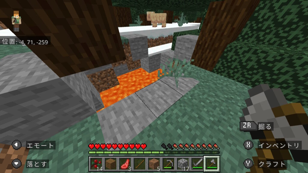 そこから少し進むとマグマ溜まりがあったので、ここからネザーインするつもりで周辺で鉄を探しつつ食料を集めることにします。ついでに羊も何匹か倒してベッド分の羊毛を確保しておきました。