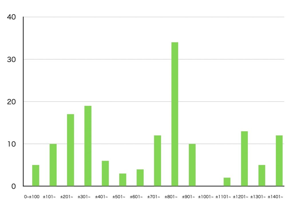 ちなみにプラスとマイナスを合算して集計してしまったのでややわかりづらくなってしまいましたが、プラス座標だと700〜900、その次に100〜400が多く、マイナス座標だと-800〜-1000、その次に-200〜-500までの範囲が多かったので、プラス域とマイナス域で若干差がありました。