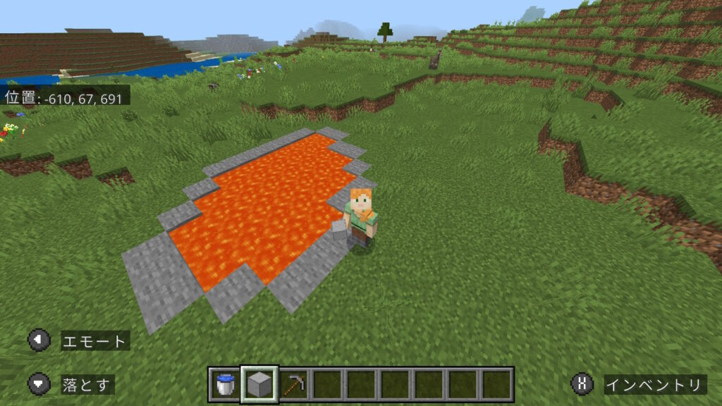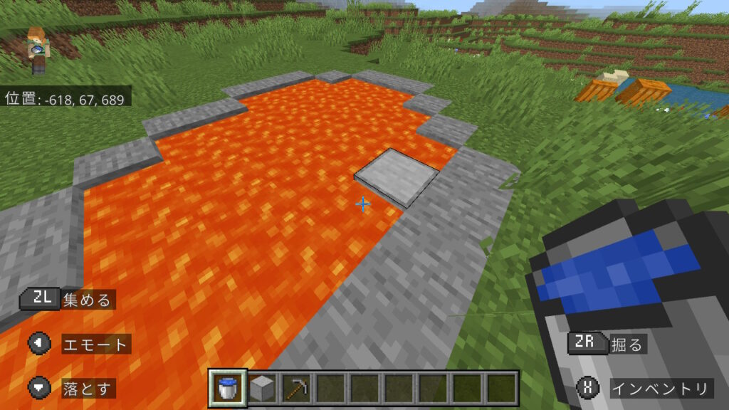 今水が張ってある下の2ブロックも黒曜石にする必要があるので、壊して溶岩を流し入れます。