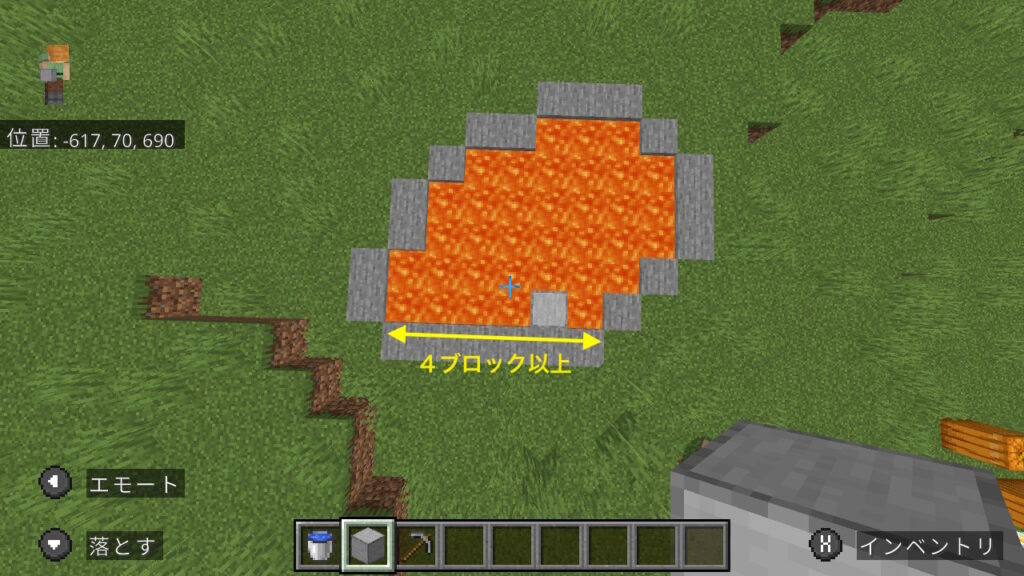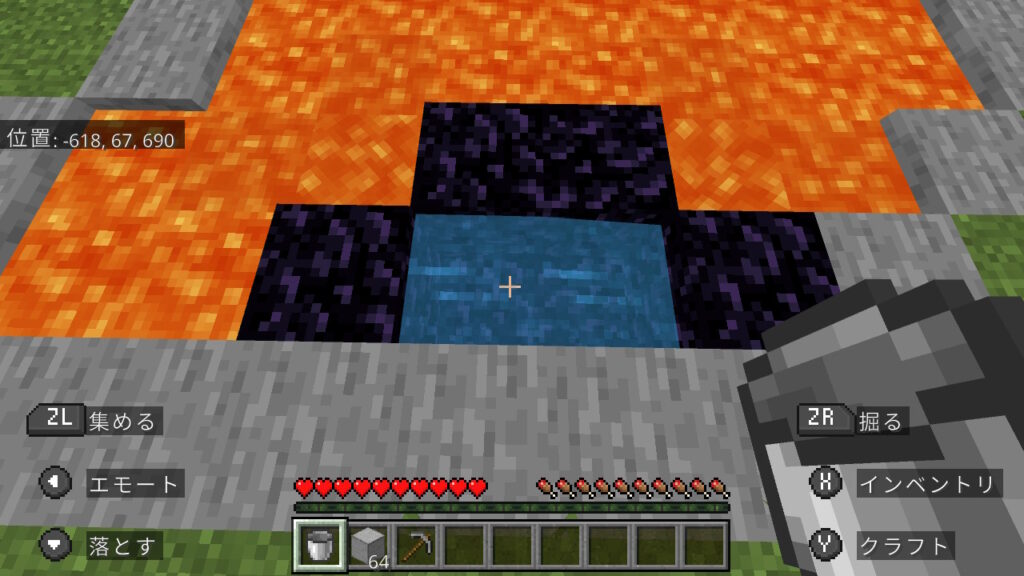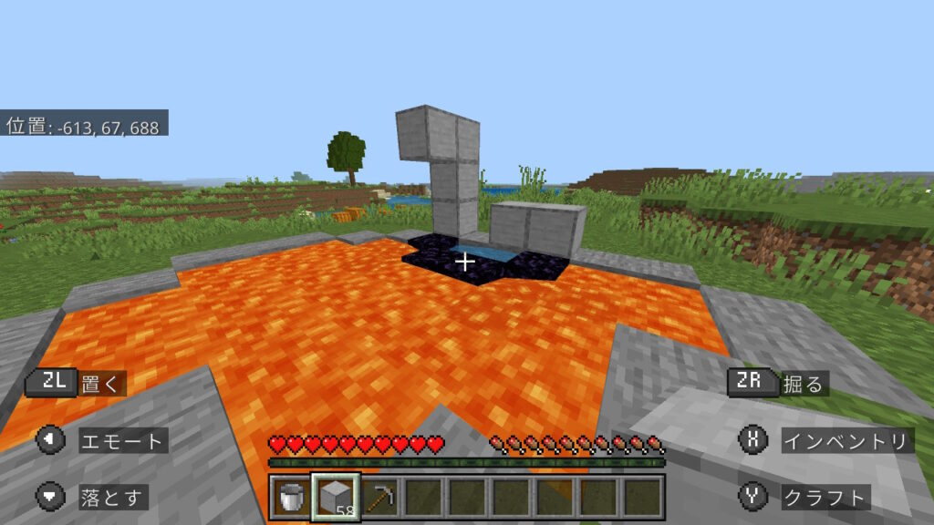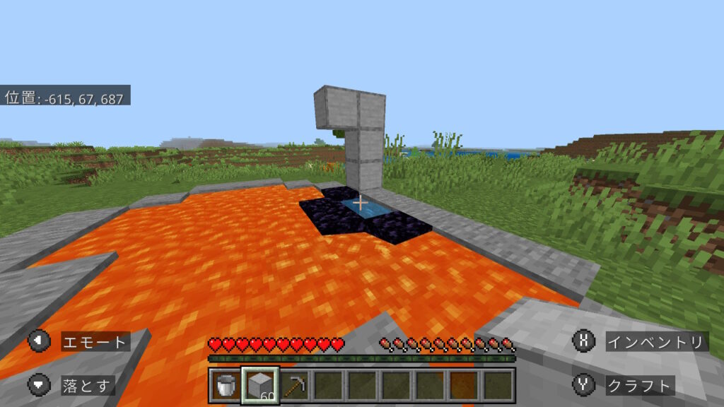 ここまで出来たら溶岩を使用し、まず両サイドの黒曜石を作ります。