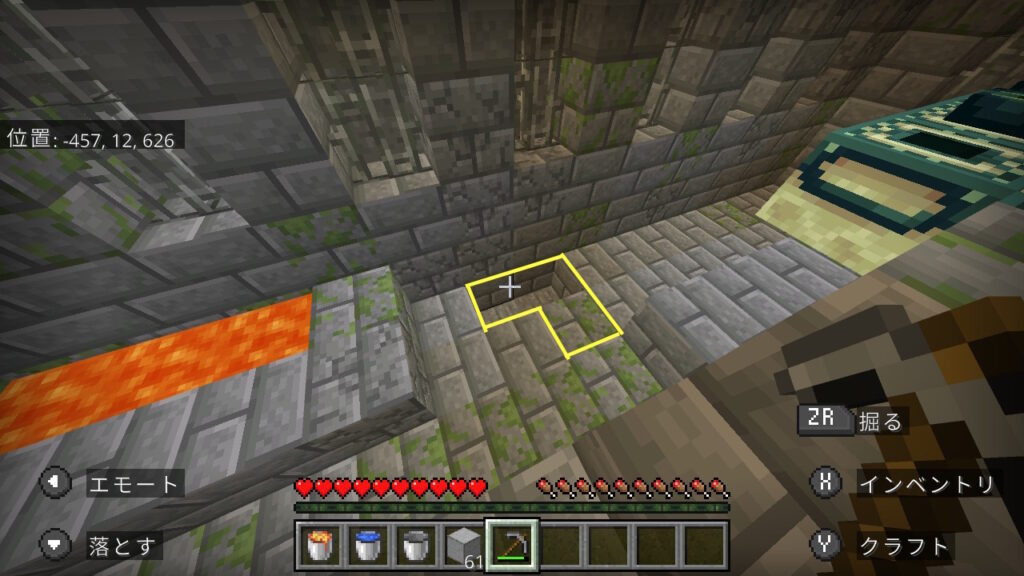 先ほどの逆L字と2マスブロックの間を空けたところ、そこの後ろ1マスを掘ります。ここを掘らないと、後で水を流した時に水流が広がってしまい、溶岩が黒曜石に変わってしまいます。