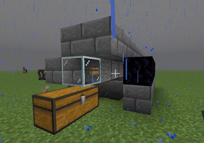ガラスは不透過ブロックにするとチェストが開かなくなるので、必ずガラスで。ボタンは水をせき止める用なので種類は何でもOKです。