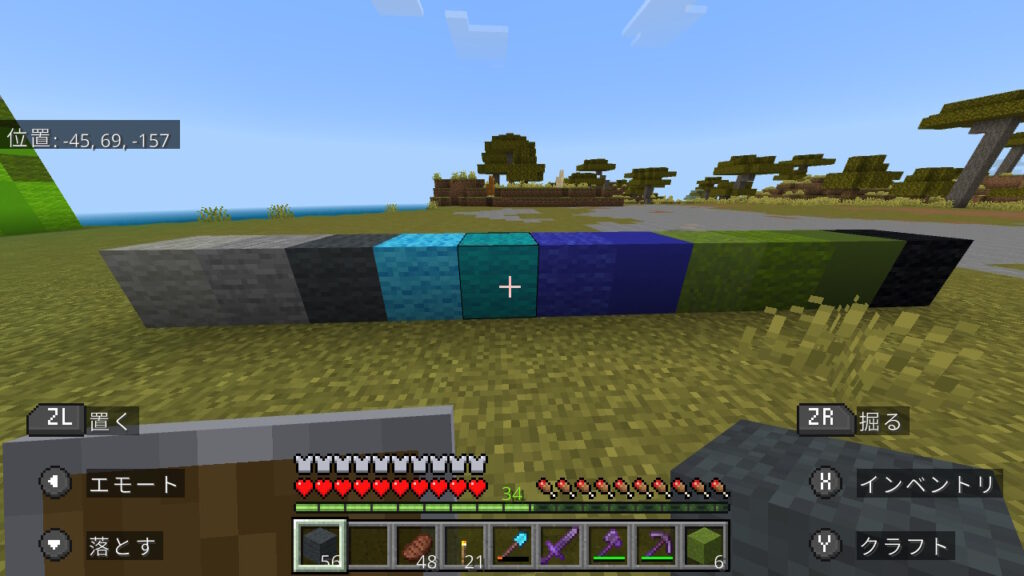 灰色の羊毛は1スタックくらい、そのほかのブロックは5スタックずつくらいあれば足りると思います。