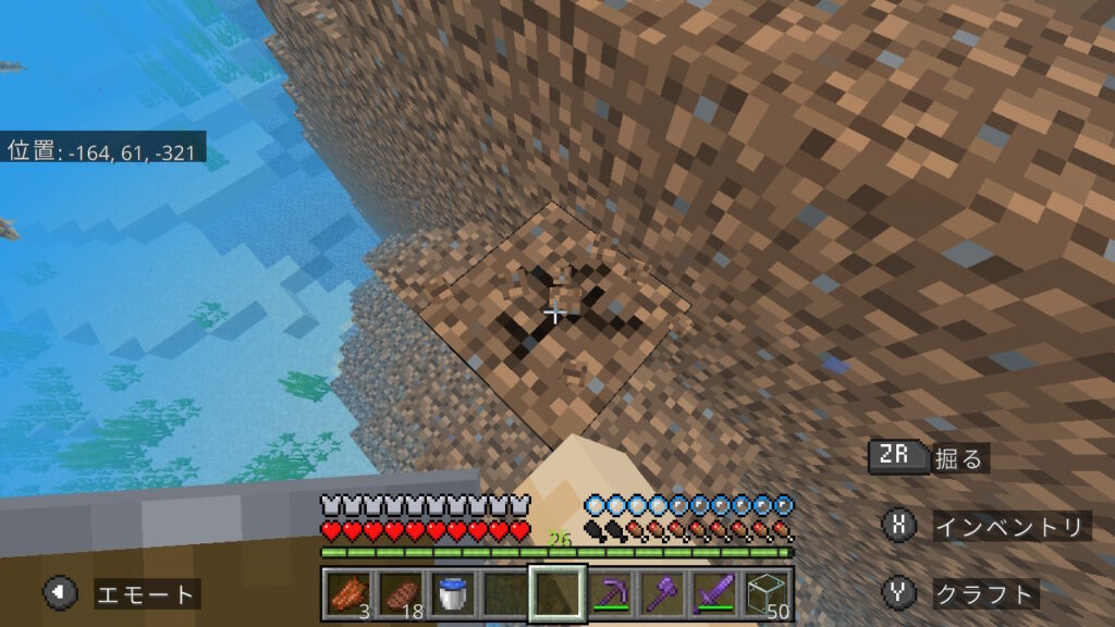 注意点として、水中で地面に足をついていない場合に時間が5倍かかるのは変わらないので、採掘する際は地面に足をつけて掘りましょう。